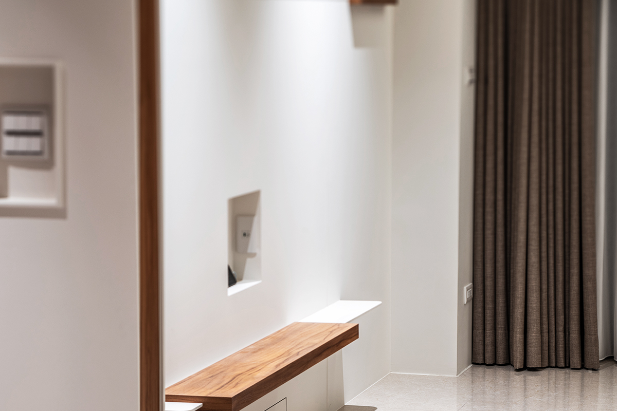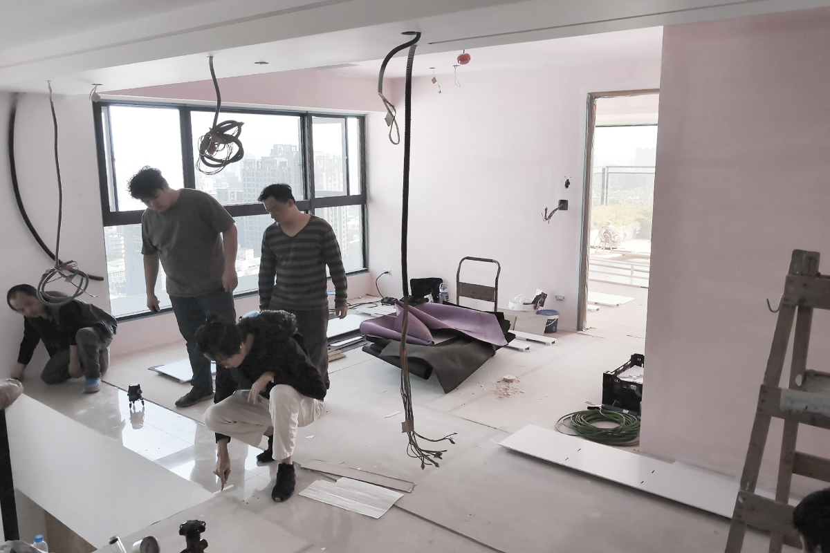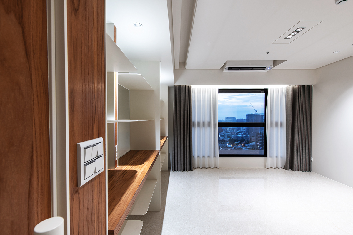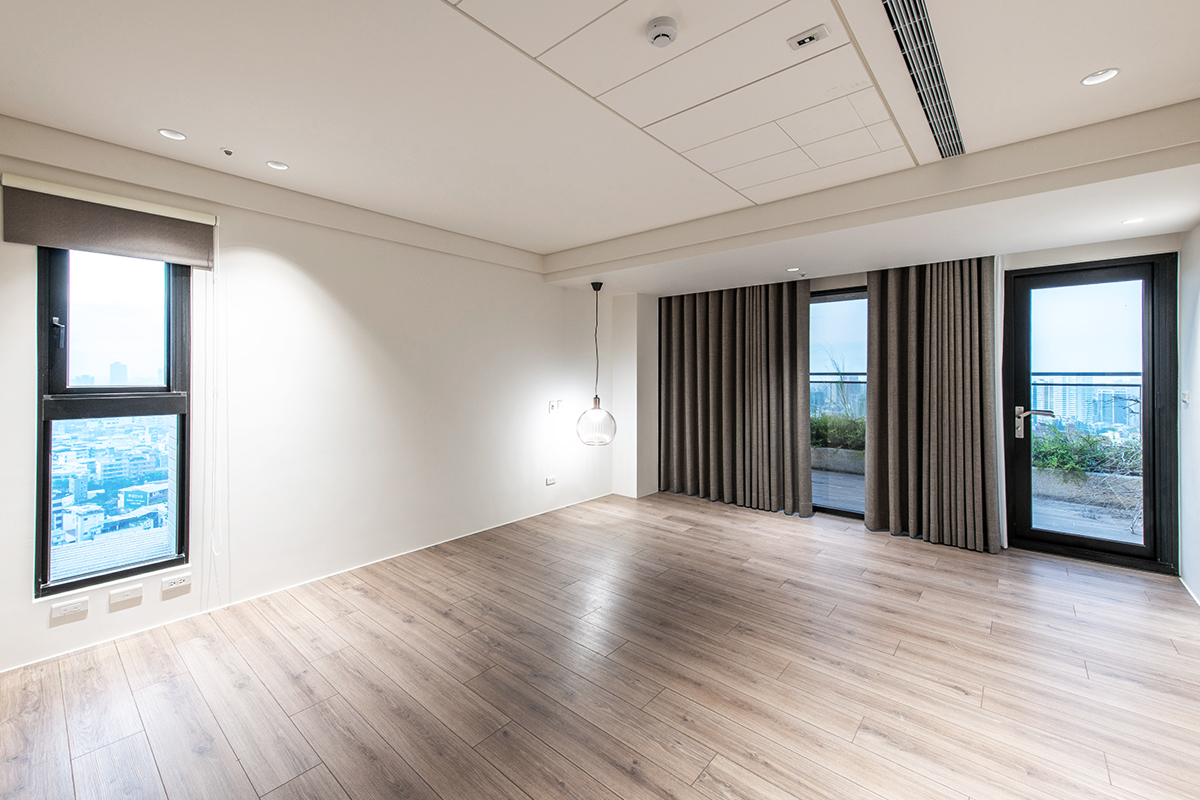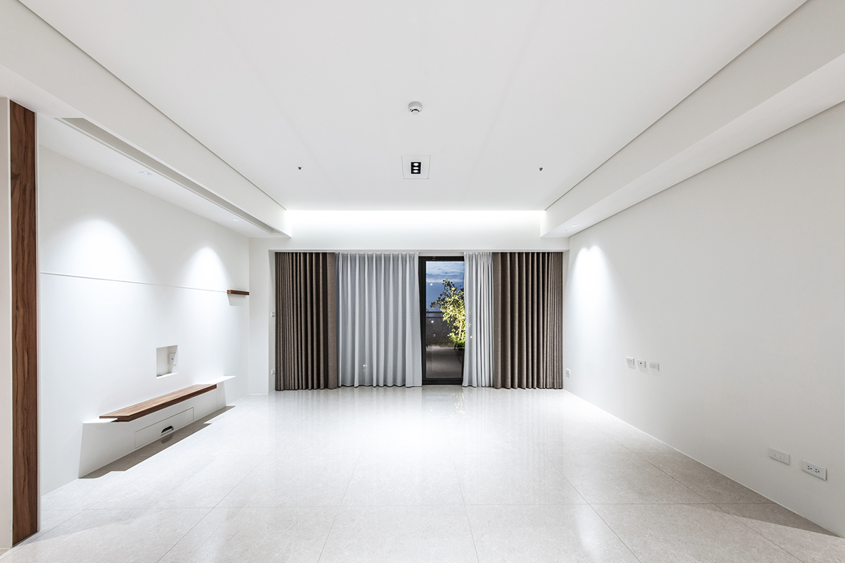 完工交屋時,屋內空間呈現出樸實的空曠感,沒有多餘的造型與裝飾,甚至沒有家具擺設。但幾近絕對平整的天花板,配上「二補二底一面」工序施作的乳膠漆塗裝,使整個空間呈現沉穩、洗鍊、絕不苟同的精神,在日照充足的時段甚至能看見大面天花的完整反光。