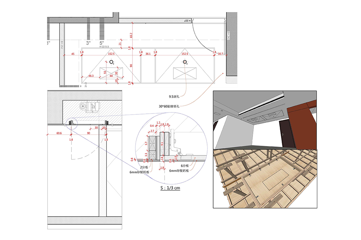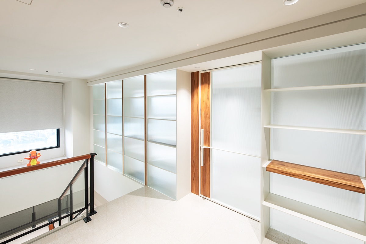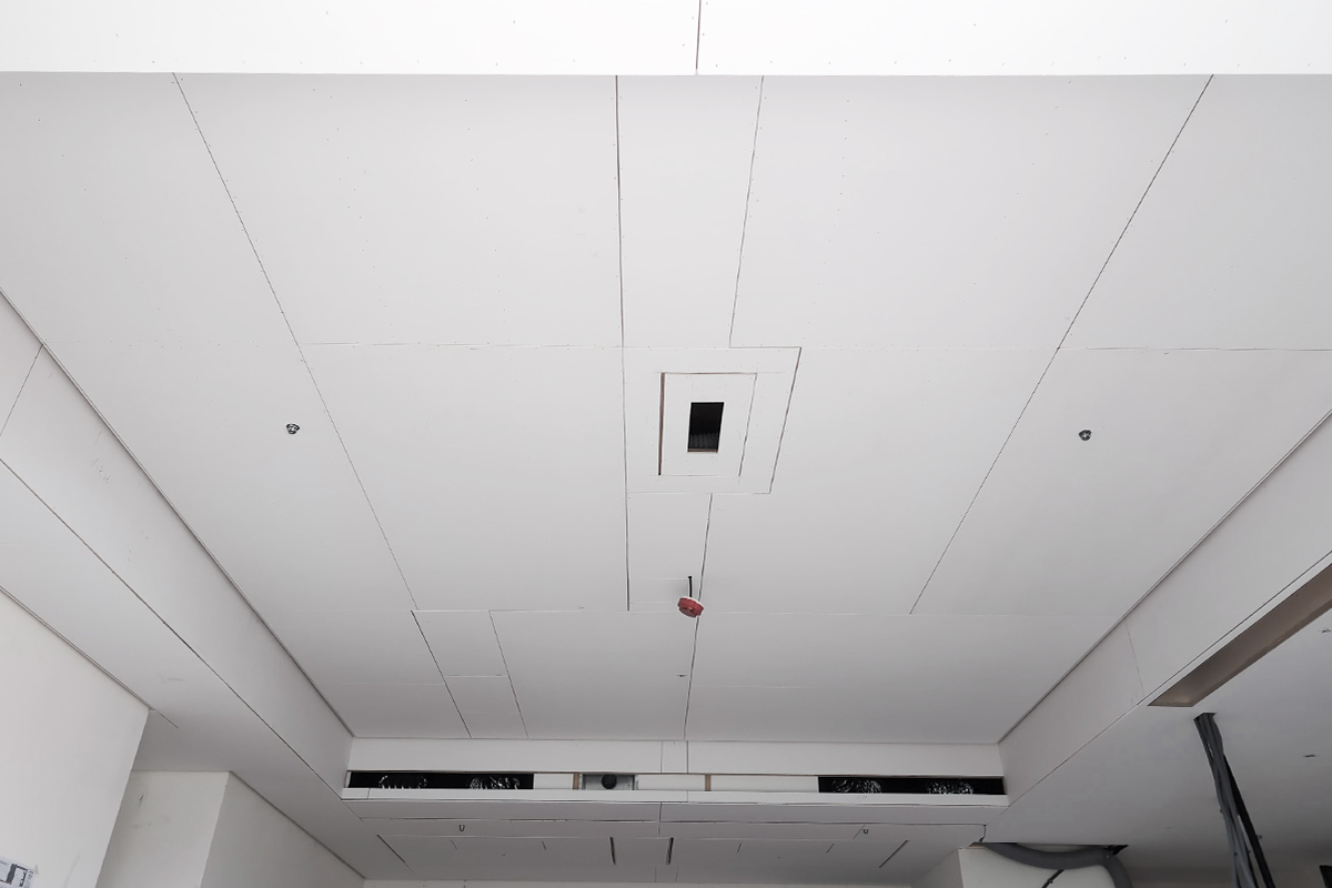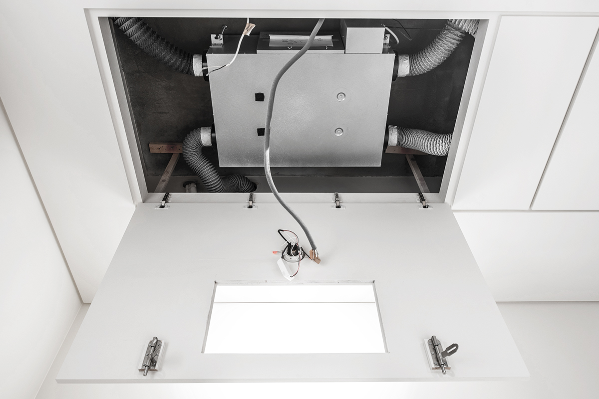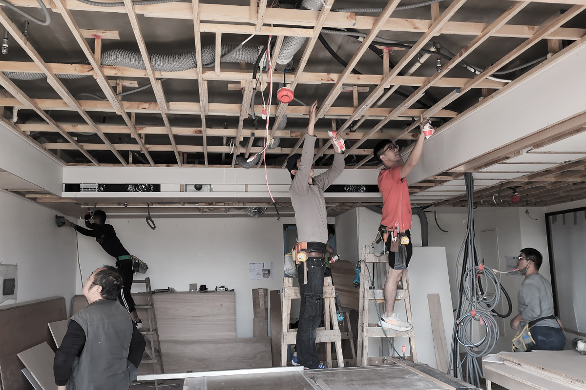 完工交屋時,屋內空間呈現出樸實的空曠感,沒有多餘的造型與裝飾,甚至沒有家具擺設。但幾近絕對平整的天花板,配上「二補二底一面」工序施作的乳膠漆塗裝,使整個空間呈現沉穩、洗鍊、絕不苟同的精神,在日照充足的時段甚至能看見大面天花的完整反光。