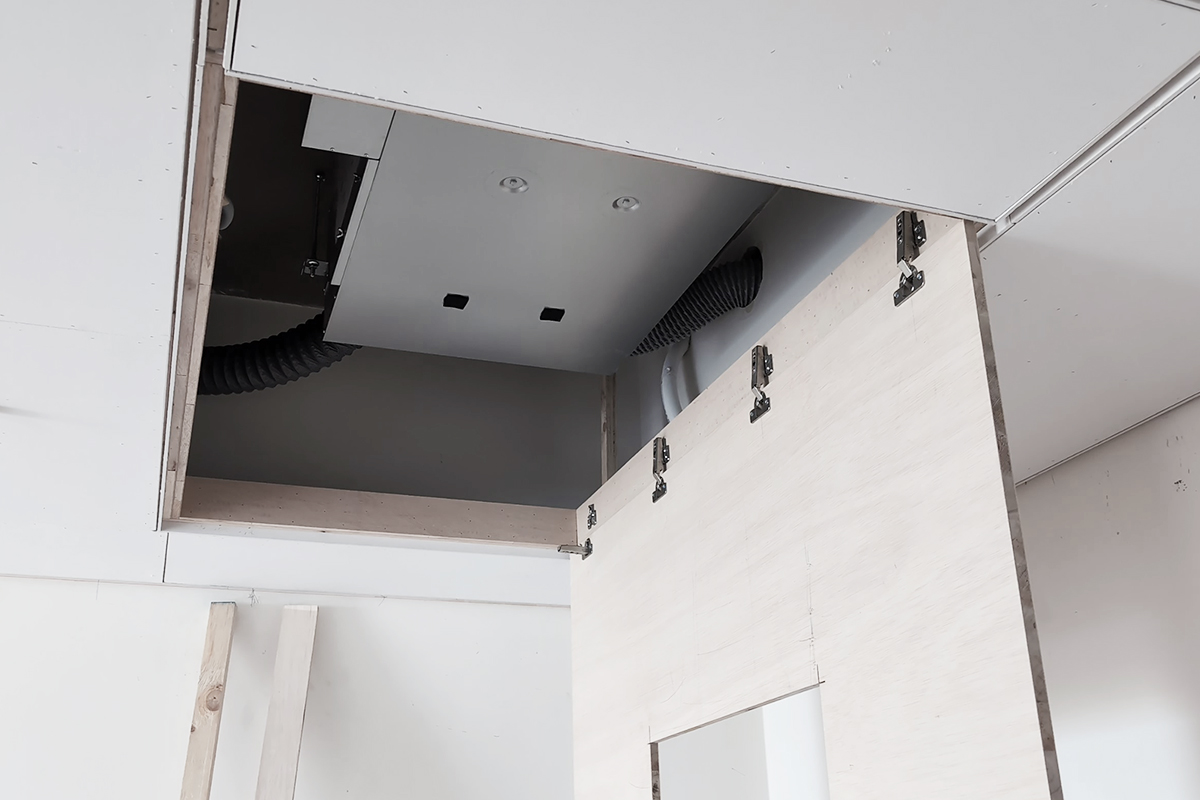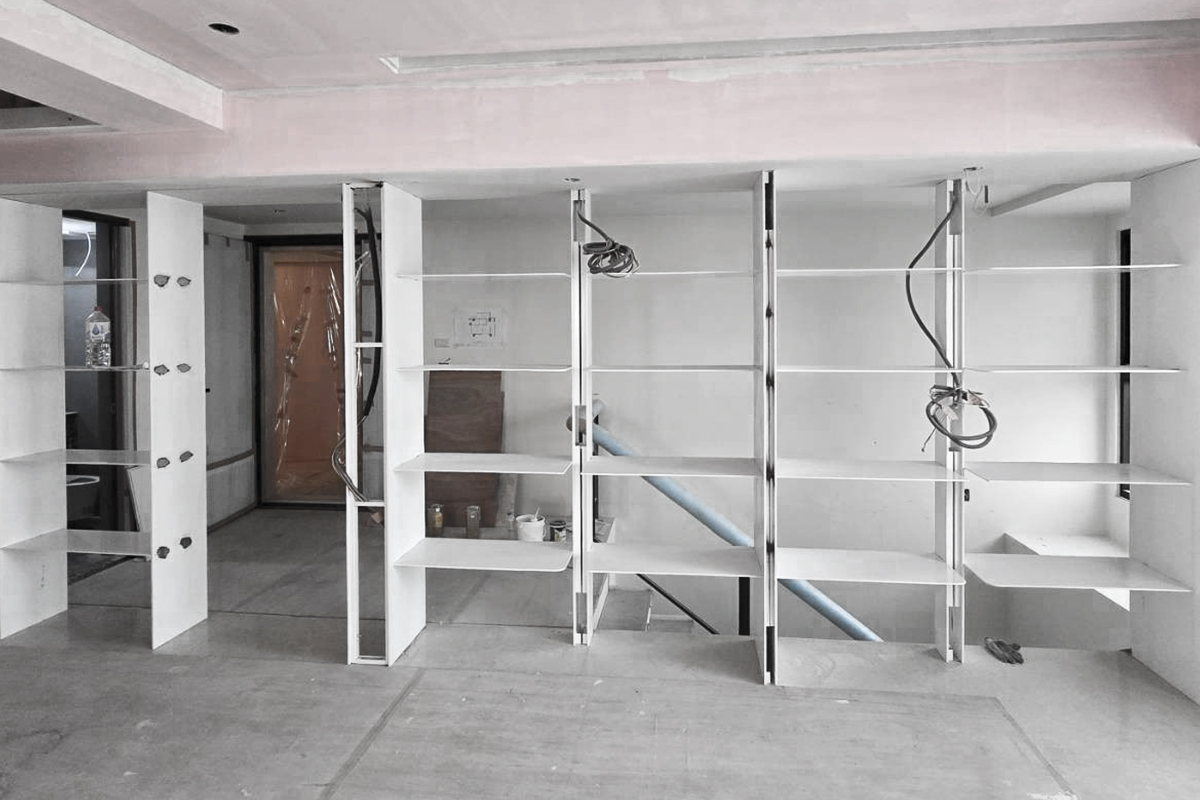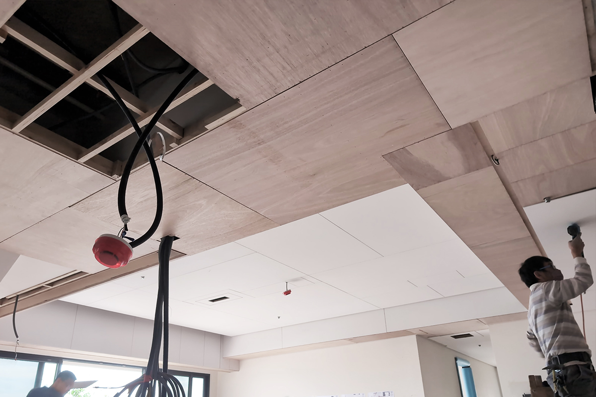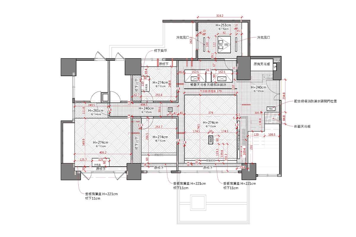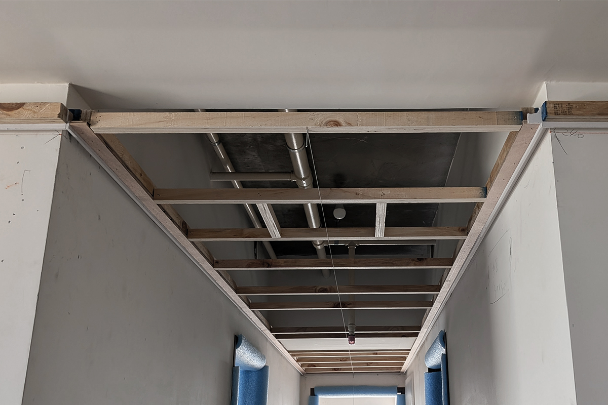 完工交屋時,屋內空間呈現出樸實的空曠感,沒有多餘的造型與裝飾,甚至沒有家具擺設。但幾近絕對平整的天花板,配上「二補二底一面」工序施作的乳膠漆塗裝,使整個空間呈現沉穩、洗鍊、絕不苟同的精神,在日照充足的時段甚至能看見大面天花的完整反光。
